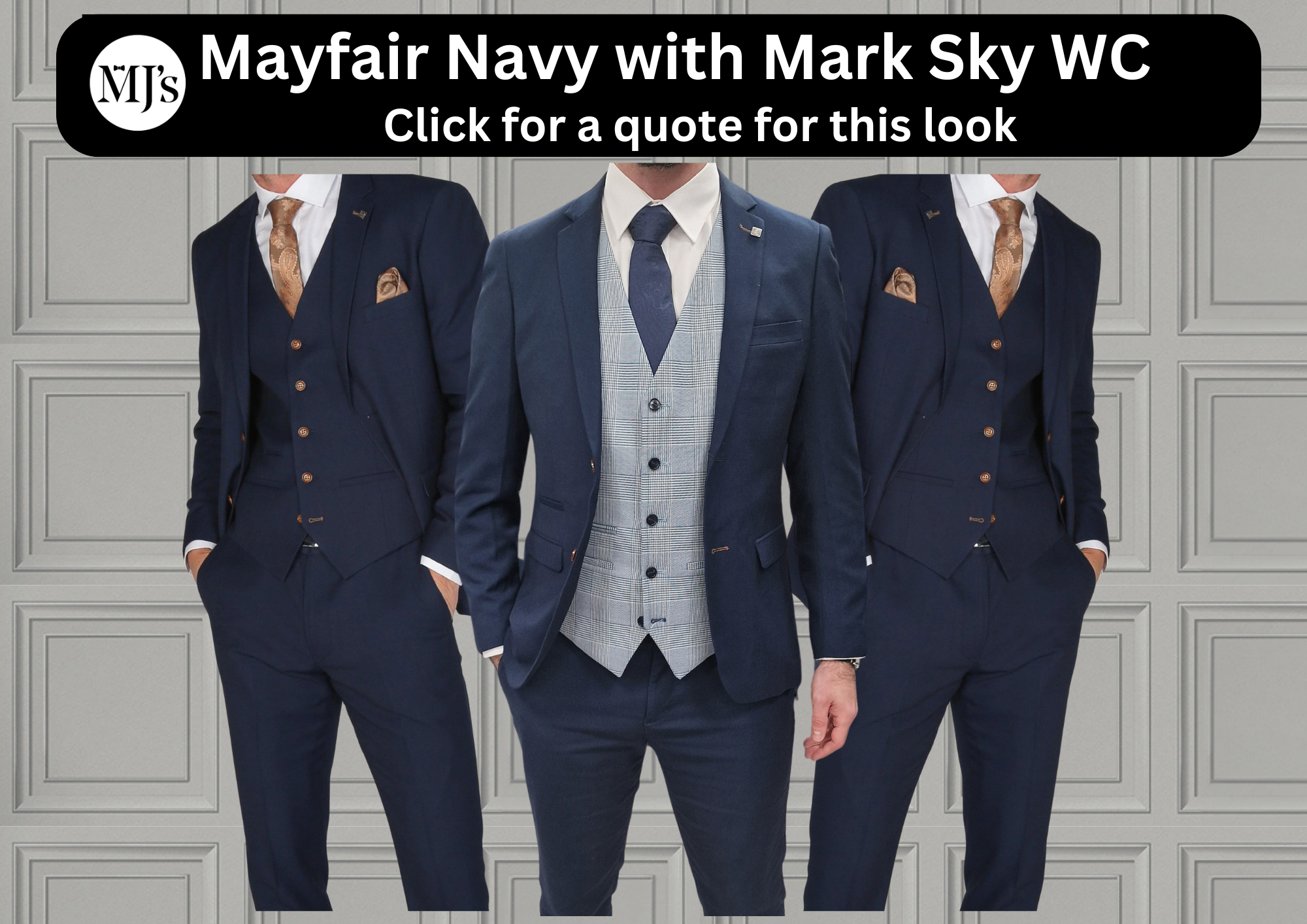 With this quote, the groom will wear the Mayfair Navy Jacket & Trouser with the Mark Sky waistcoat with groomsmen wearing the Mayfair Navy 3 Piece Suit. You'll have the option to or purchase.