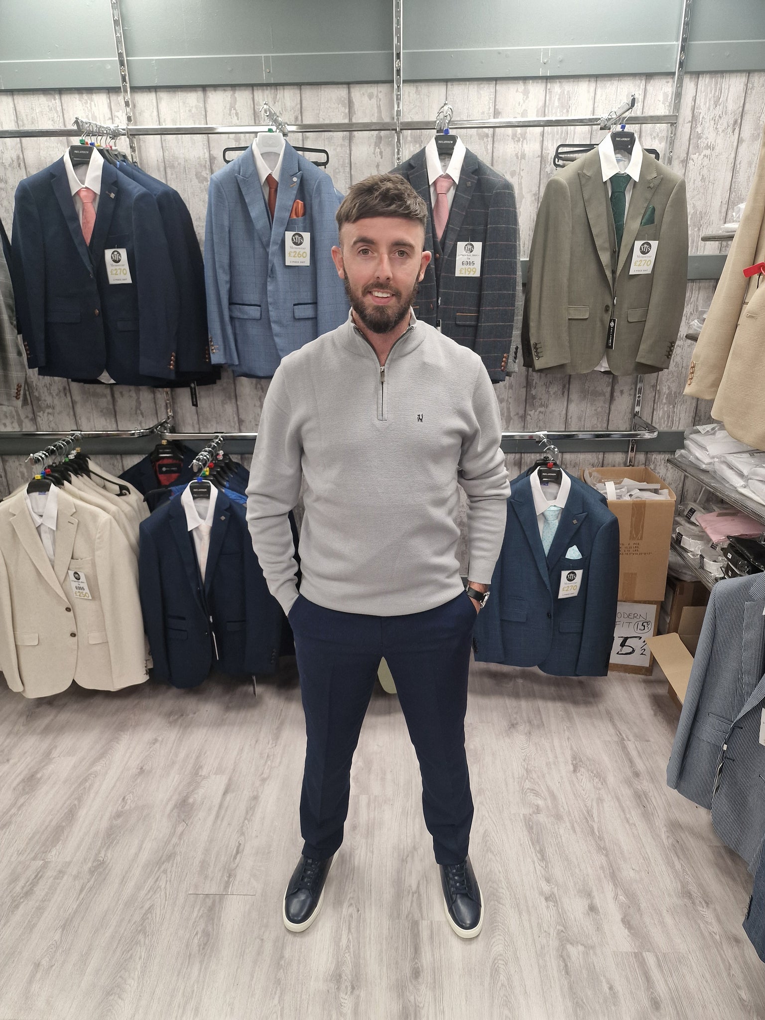 Bold, confident, and effortlessly smart—this look pairs the rich Ultan Grey half zip with our tailored Mayfair Navy trousers for a refined take on smart casual. It’s the perfect outfit for modern office environments where style matters but suits aren’t essential. The half zip offers warmth and polish, while the navy trousers keep the silhouette sharp and versatile.