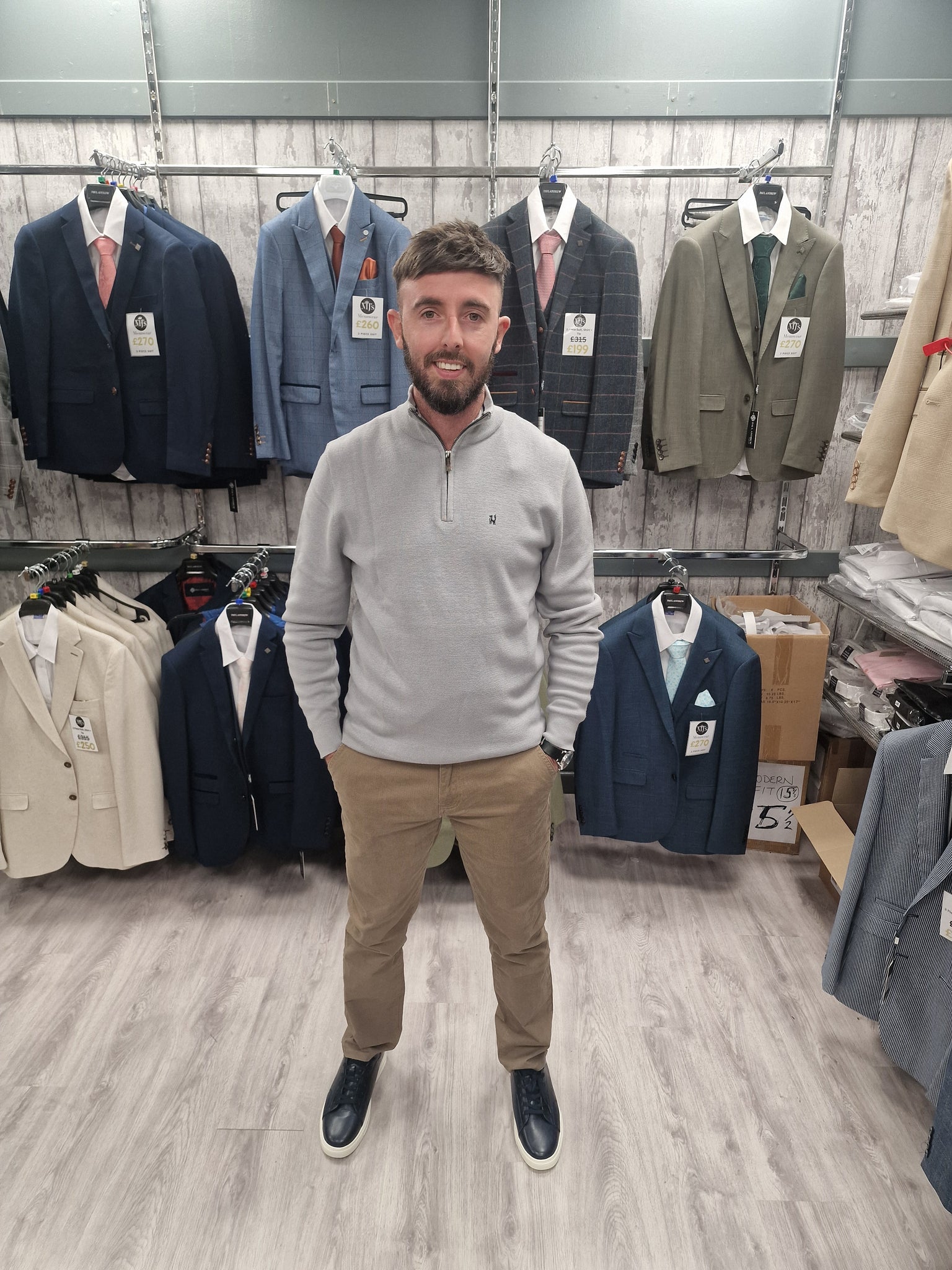 Confident, clean, and effortlessly smart—this look pairs the rich Ultan Grey half zip with crisp sand chinos for a modern take on office-ready style. It’s ideal for workplaces where full suits aren’t required but looking sharp still matters. The half zip adds warmth and polish, while the neutral chinos keep the outfit fresh and versatile.